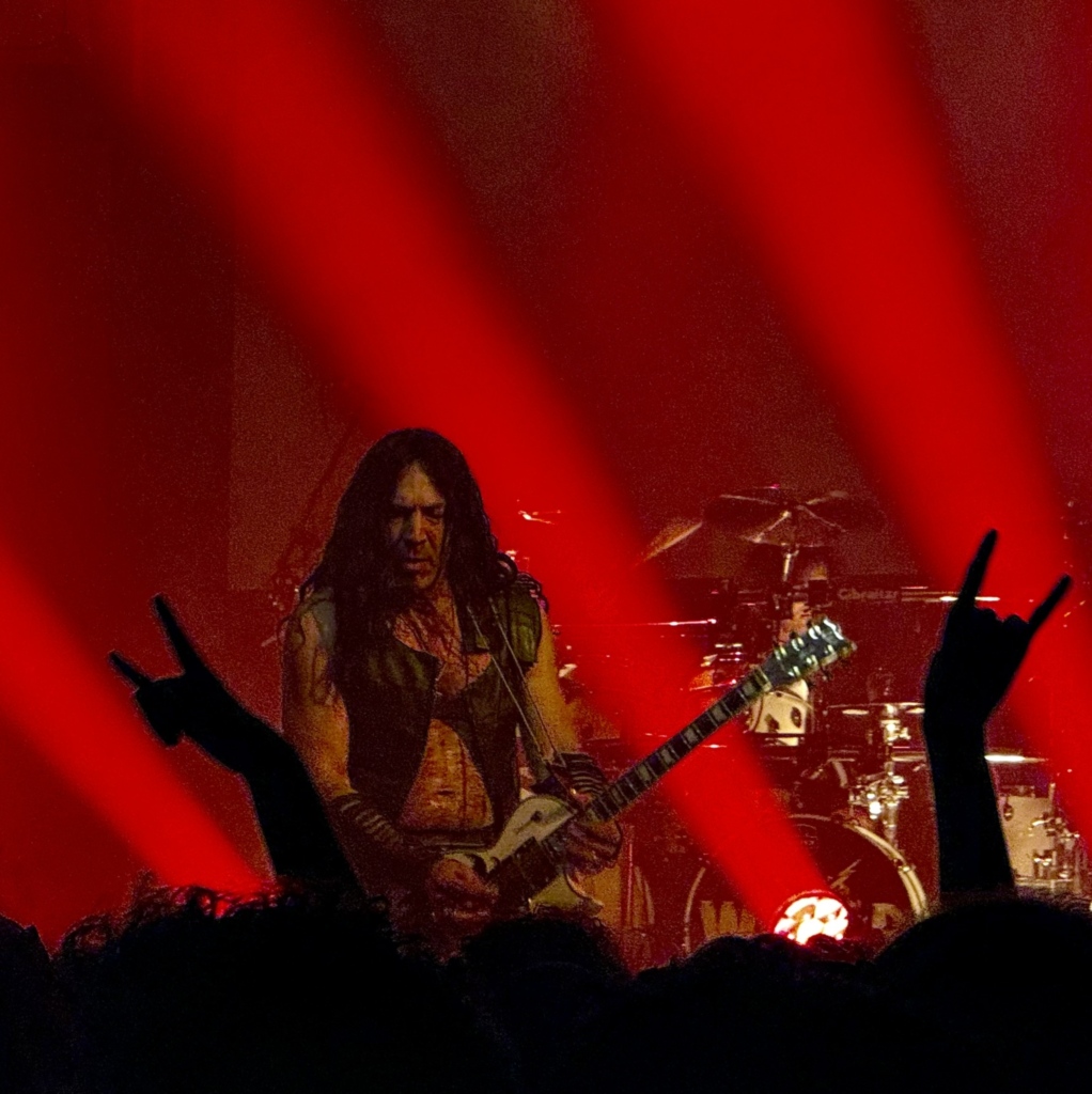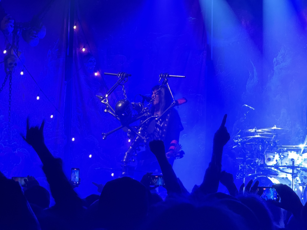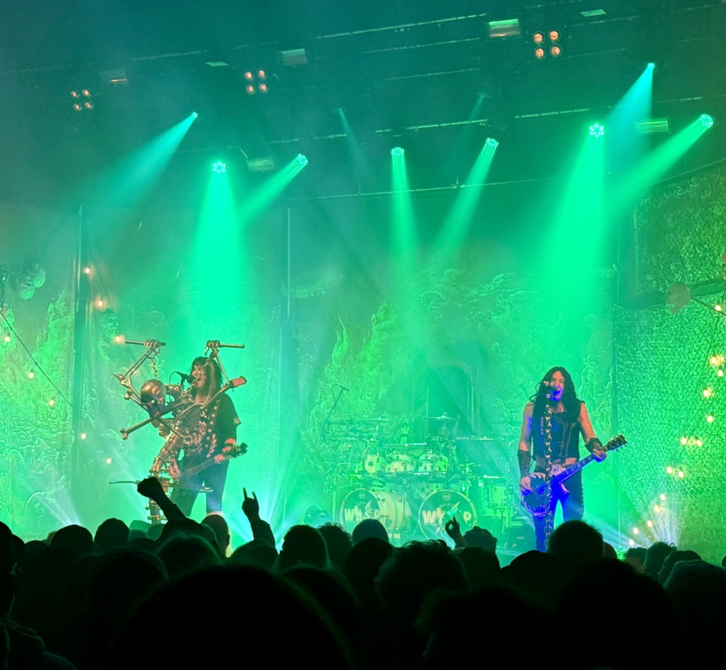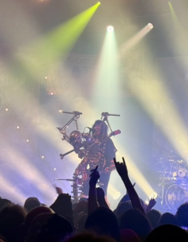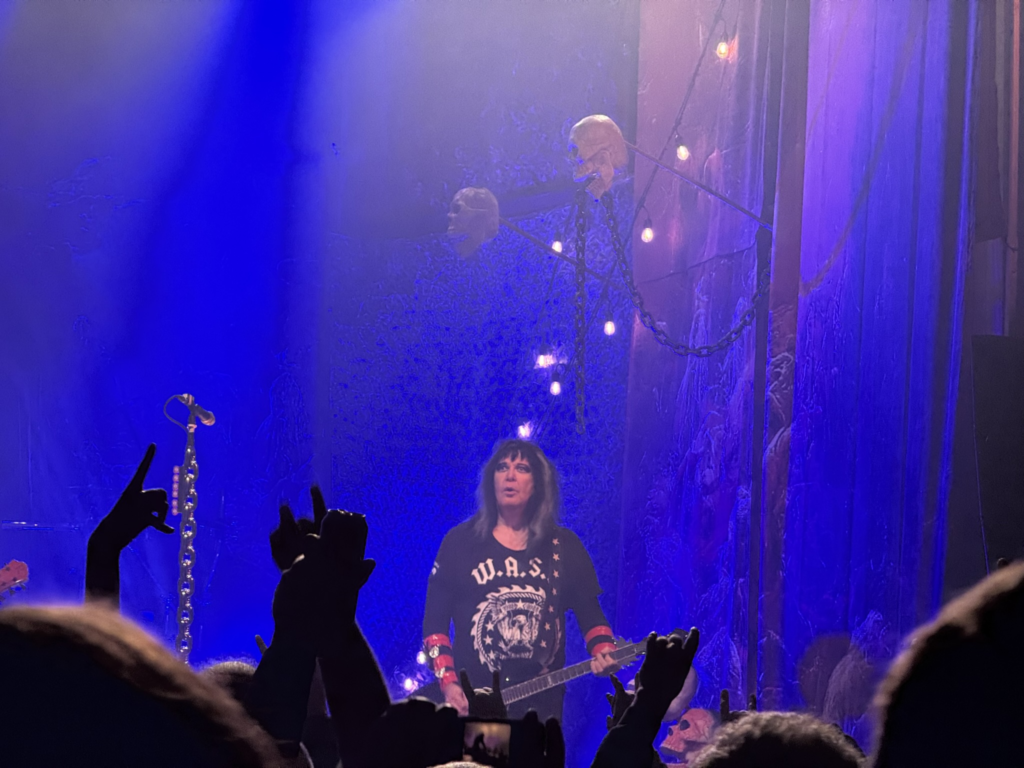 A photo captures a live performance by W.A.S.P., with lead singer Blackie Lawless center stage, illuminated by blue light. The stage decorations include skulls, chains and a backdrop that creates a spooky atmosphere enhancing the heavy metal concert experience.