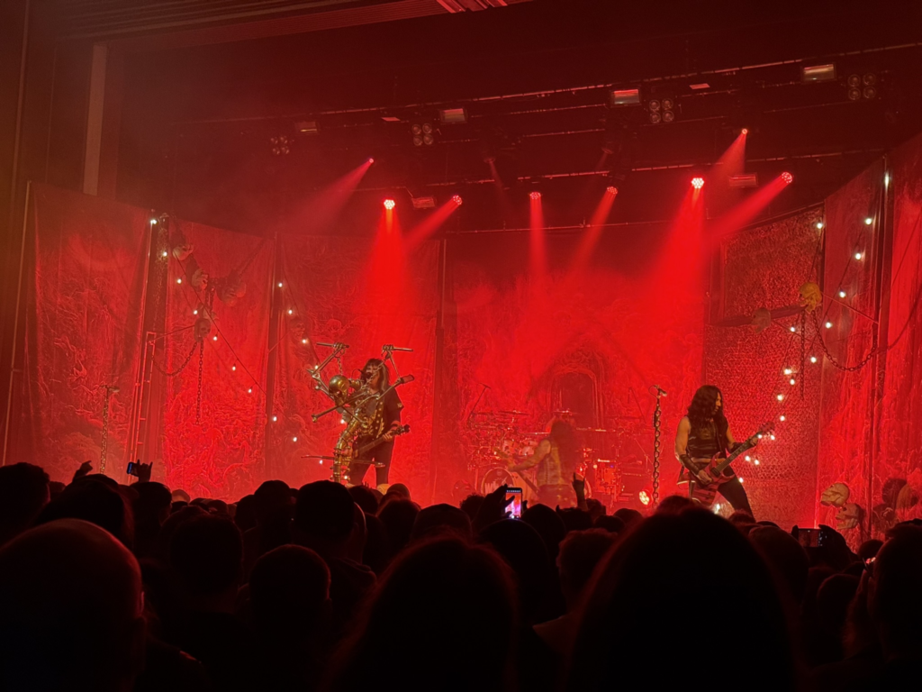 live music metal band concert stage red lighting crowd performance guitars drums skulls chains macabre dramatic audience entertainment