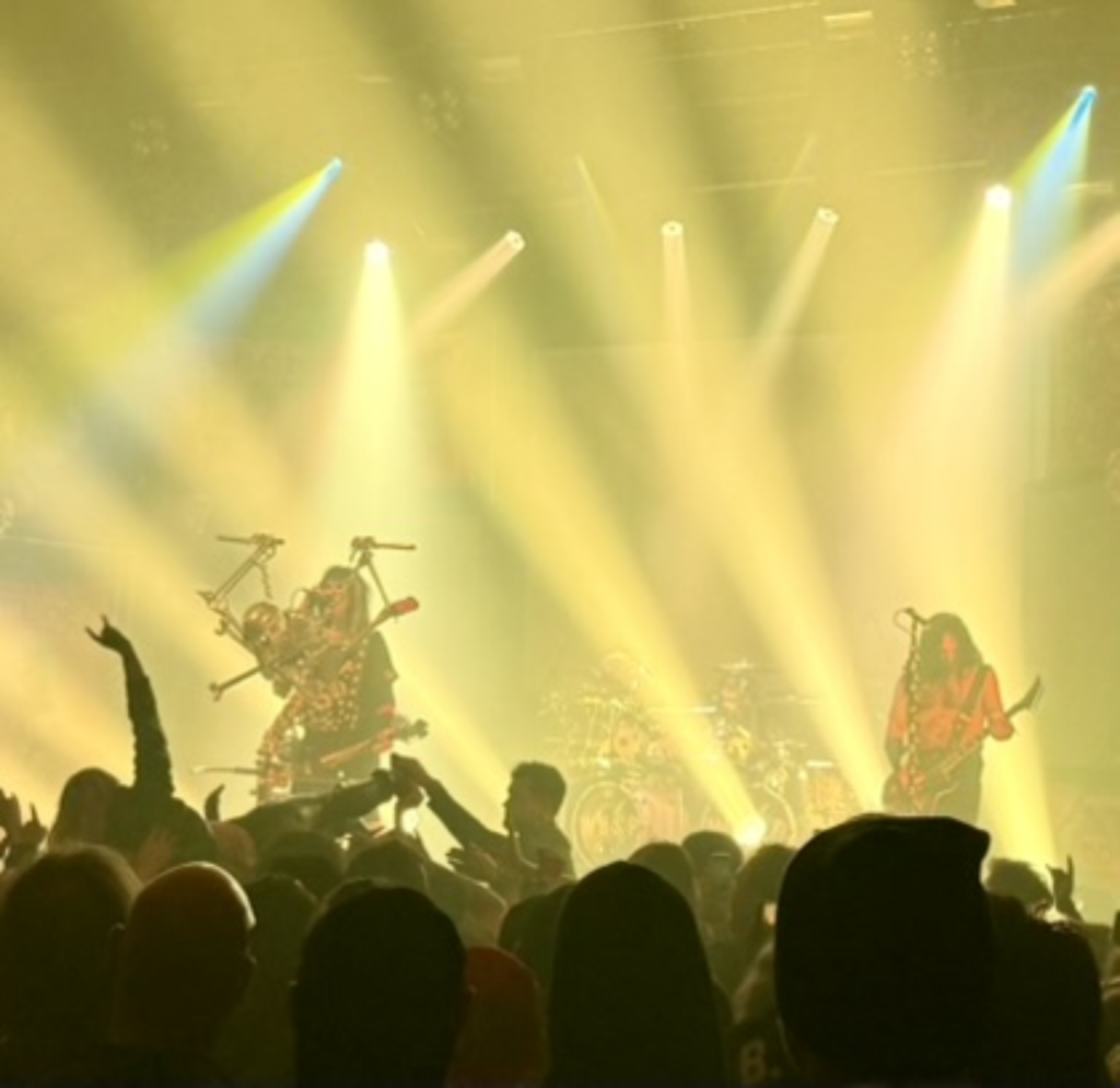 live performance stage lights rock concert heavy metal crowd music performer skeleton skull fan horns hand gesture